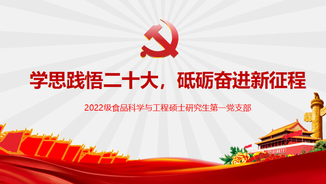 “百年恰风华,世纪正青春”。在党的二十大精神指引下,食品科学与工程学院2022级食品科学与工程硕士研究生第一党支部将全面持续学习宣传贯彻党的二十大精神,不断提高自身思想境界,为实现中华民族伟大复兴而奋斗!