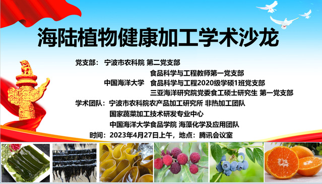 本站讯 为进一步学习贯彻党的二十大精神,加强学术交流,4月27日,开·云app官方网站下载安装食品科学与工程学院海藻化学及应用研究室付晓婷教授团队与宁波市农科院农产品加工所首席专家凌建刚研究员团队开展了支部联合党建活动及“海陆植物健康加工”学术沙龙。