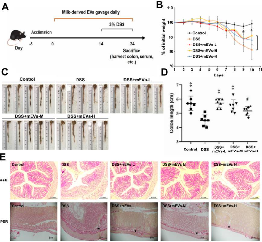 炎症性肠病(IBD)是全球性的健康问题,常伴随着肠道免疫稳态紊乱以及肠道菌群失调。免疫抑制药物是目前IBD的主要治疗方法,但药物治疗过程中可能引起骨髓抑制、便秘、嗜睡等副作用,对宿主肠道菌群也有一定的负面影响。目前没有理想的IBD治疗药物。基于调节肠道免疫和靶向肠道菌群的特殊膳食补充剂是目前预防、缓解或治疗IBD的研究热点。本研究报道了牛乳来源的天然纳米细胞外囊泡(mEVs)对结肠炎症的缓解和保护作用,揭示了其通过调节宿主肠道免疫稳态和肠道微生物的作用机制,证明了mEVs作为一种潜在的肠道稳态调节剂在预防和治疗IBD中的作用。