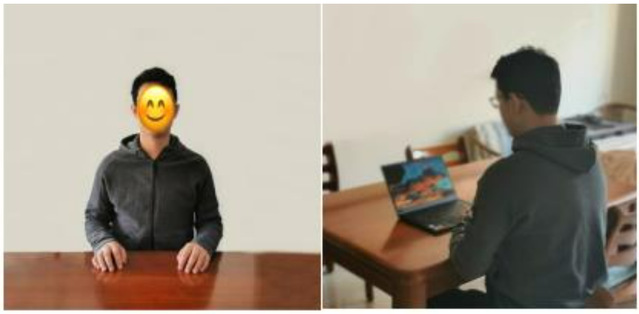 2.双机位模式:准备一台电脑(带摄像头和麦克风)和一部智能手机,或两部智能手机。两台设备中,第一台为主设备(建议使用笔记本或PC机),要求放置在考生座位正前方,视频监控范围应保证考生在坐姿状态下能够完整清晰覆盖头部到桌面位置,面试过程中要始终保持双手在屏幕中显示;另一台为辅助设备,放置于考生后方45度位置,确保监控范围覆盖第一台设备的显示屏幕和考生本人头部、背部、手部,标准规范参考下图。两台设备应全部打开视频功能,关闭除远程面试系统以外的其他软件(含浏览器、QQ、微信、文档、手机短信等)。辅助设备要关闭音频功能,避免影响复试。