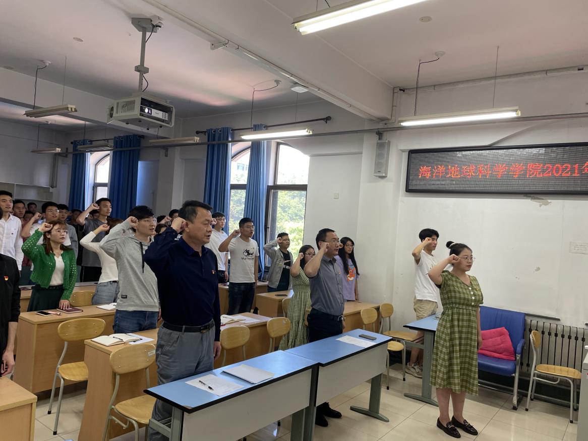 誓师大会由海洋地球科学学院团委副书记郭子悦主持。伴随着神圣庄严的《国际歌》,全体毕业生党员面对党旗庄严宣誓,重温入党誓词。之后学院各学生党支部党员代表依次发言。党员同志们对学校和学院的培养表达了由衷的感激之情,表示将会始终以一名共产党员的标准严格要求自己,在离校期间主动发挥党员的先锋模范作用,为同学们做好相关服务工作;在未来的工作学习中,发扬“海纳百川 取则行远”的校训精神和“涵海励志 博古崇今”的院训精神,坚定理想信念,为学院和母校争光,为党和国家的发展建设做出自己的贡献。