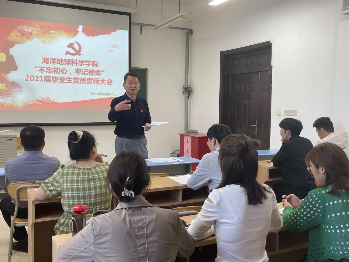 为引导毕业生党员充分发挥先锋模范作用,牢记初心使命,进一步营造“文明离校树先锋,服务母校我先行”的良好氛围,6月4日上午,海洋地球科学学院开展“不忘初心、牢记使命”毕业生党员誓师大会。海洋地球科学学院党委书记吴军、党委副书记张殿镇出席会议并讲话。