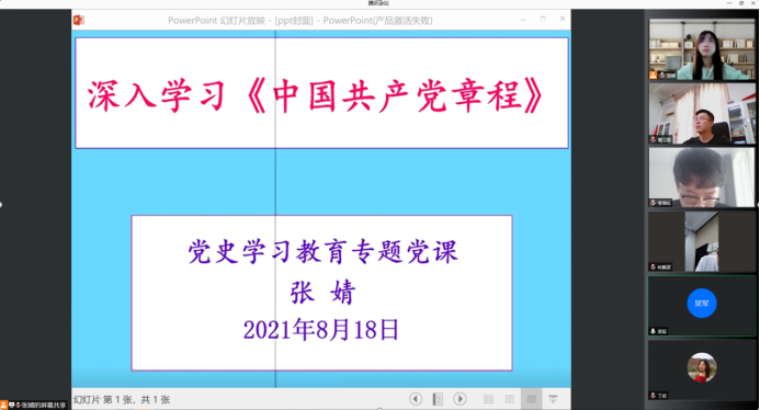 本站讯 2021年8月18日,海洋地球科学学院召开“深入学习《中国共产党章程》”党史学习教育专题党课,党课由学院机关党支部书记张婧主讲,机关党支部与2020级地科系硕士研究生党支部全体党员参加学习。