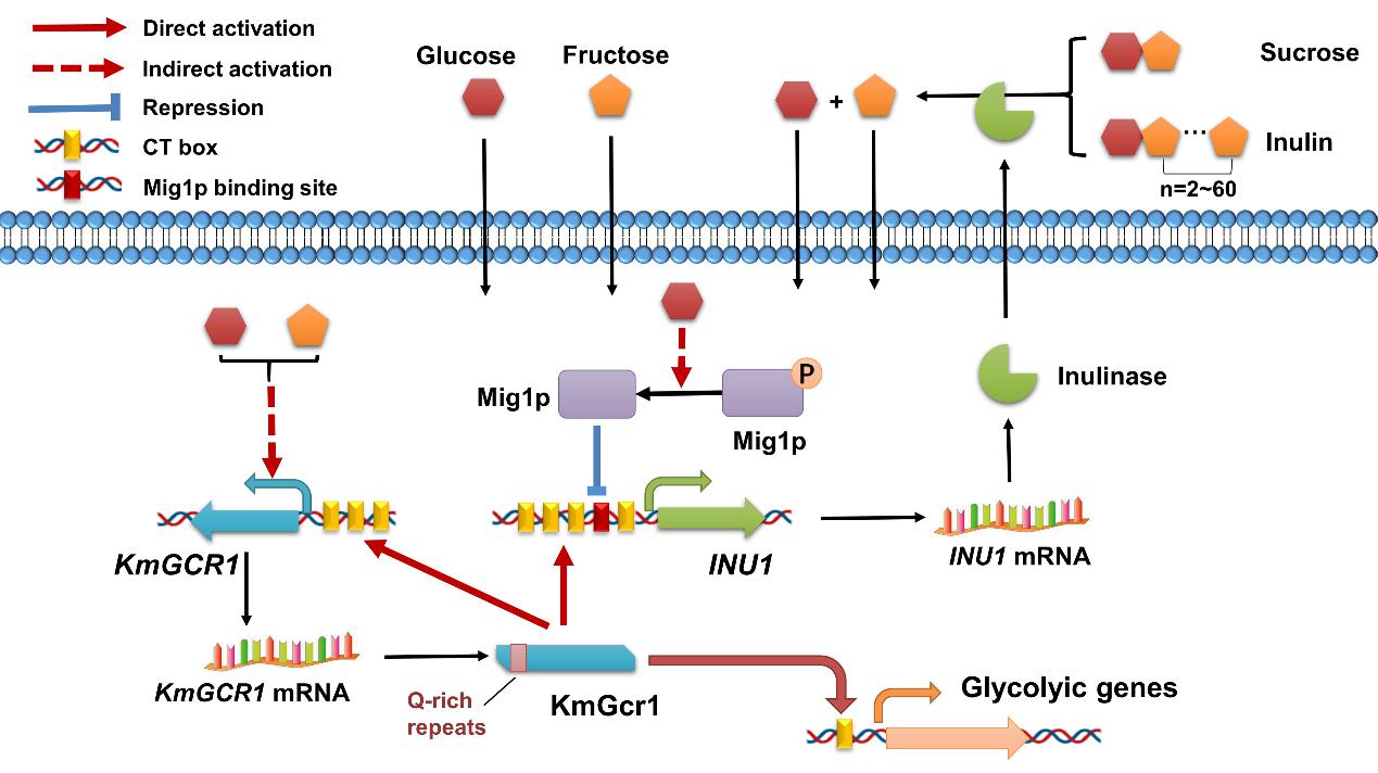 菊粉酶是作用于菊粉β-2,1糖苷键的多糖水解酶,具有重要的应用价值。马克斯克鲁维酵母是最适于菊粉酶工业化生产的菌株,但其菊粉酶基因的转录激活机制未知。该研究揭示了马克斯克鲁维酵母中由糖酵解调控因子KmGcr1p调控的正反馈调控模式的菊粉酶基因转录激活新机制,该机制不同于已报到的丝状真菌,但在产菊粉酶酵母菌中具有普遍性。此外,该研究还发现,KmGcr1p独特的Q-rich重复模块通过影响转录因子蛋白可溶性和DNA结合能力力维持KmGcr1p的转录活性。该研究拓展对酵母菌糖苷水解酶转录激活机制的认识,也为高菊粉酶活力工程菌株构建奠定了理论基础。