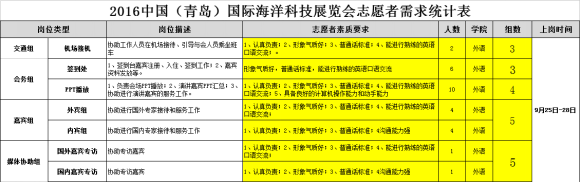 (三)自愿参加展会前的培训及相关活动。志愿者服务时间为2016年9月24日至29日(具体时间和到岗人数由组委会统一安排),志愿者原则上要求在展前接受场地培训和岗位培训(时间约1天),具体培训时间另行通知;