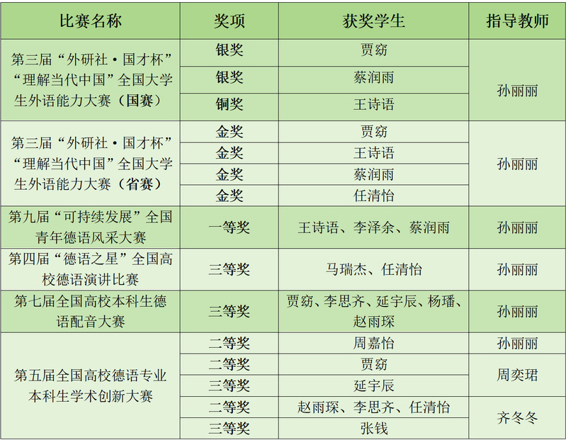 中国海大德语系学子的优异竞赛成绩得益于外国语学院“立德树人、以赛促学”的育人理念。德语系积极推进思政教育与专业教学有机融合,通过创新教学模式、系统化备赛辅导、拓展实践平台等,全方位提升学生的语言基本功、跨文化交际能力与国际传播素养,为学生持续取得佳绩奠定坚实基础。2025年,德语系学子在多项高级别赛事中斩获殊荣(如图)。