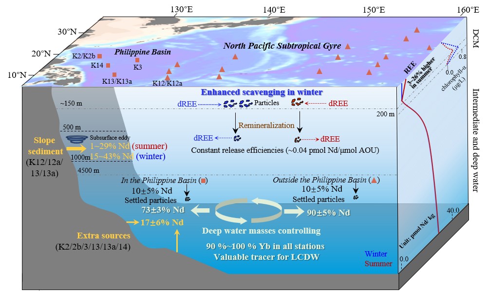 图1西北太平洋溶解态REEs全水柱的季节变化、影响因素及深层水示踪应用概念图