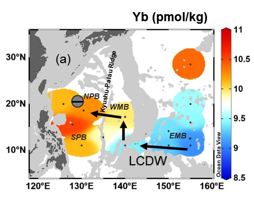 结果表明,叶绿素最大层以浅的水体中,冬季溶解态REEs的浓度显著低于夏季。这种季节性变化主要是因为冬季生物活动强,颗粒物对REEs的吸附清除的增强。研究还发现,冬季菲律宾岛陆坡输入对NPSG西部中层水体REEs的贡献高于其他季节,以钕(Nd)为例,占观测浓度的26%±11%。并且,NPSG区REEs在再矿化过程中的释放效率没有季节变化,和北大西洋环流区一样,均为0.04 pmol Nd/μmol AOU(表观耗氧量)。这一恒定比值在追踪REEs外部来源、表征浮游生物群落结构、估算有机碳再矿化速率方面具有应用潜力。此外,验证了镱(Yb)在4000m以深大洋深水层的水团路径示踪能力。在4500m,Yb浓度能清晰反映下层绕极深层水(LCDW)在马里亚纳海盆和菲律宾海盆的分布(图2)。在深层水温度受气候变化干扰时,Yb可以作为有效的化学示踪工具,补充传统温盐指示参数的不足。
