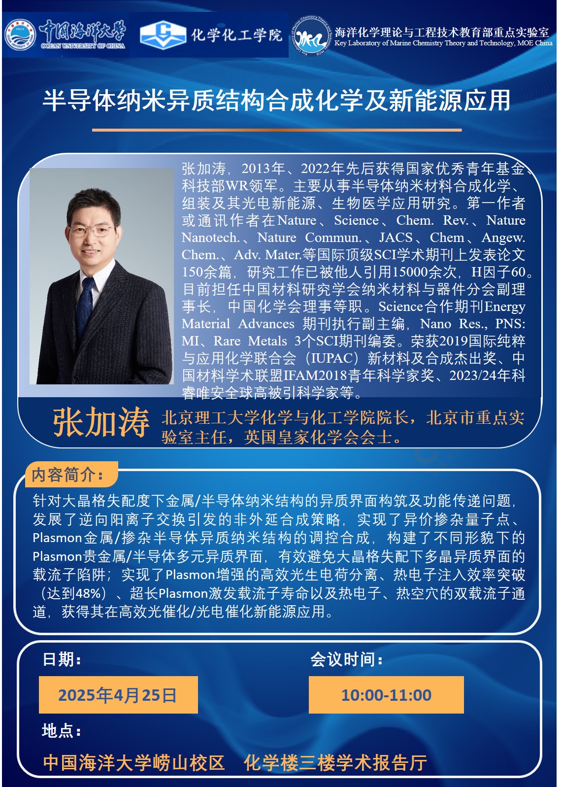 4月25日 张加涛教授报告:半导体纳米异质结构合成化学及新能源应用
