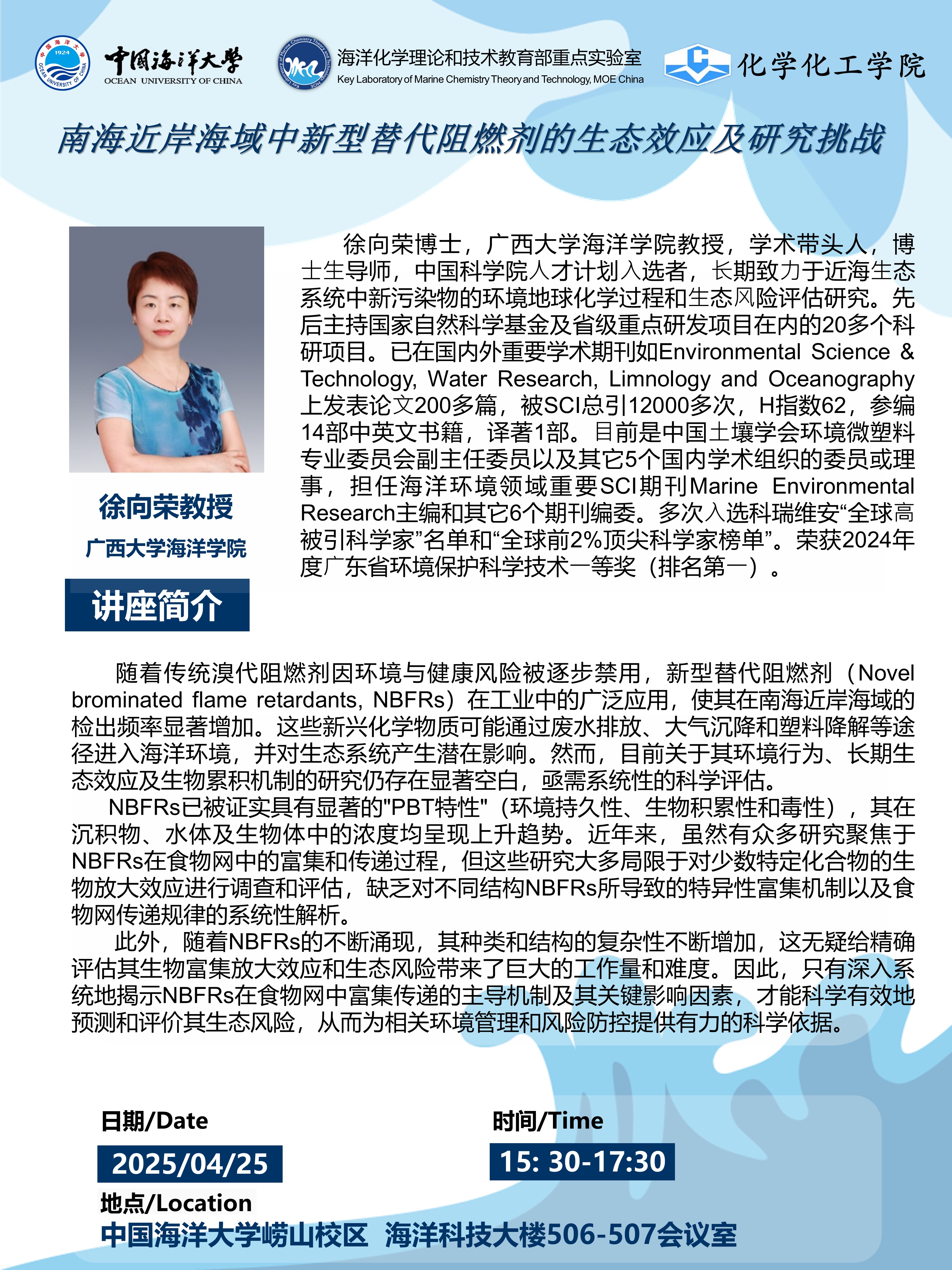 4月25日 徐向荣教授报告:南海近岸海域中新型替代阻燃剂的生态效应及研究挑战