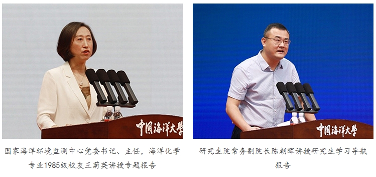 典礼结束后的入学教育专题报告阶段,王菊英与研究生院常务副院长陈朝晖先后为新生作了大海洋观系列题为《我国海洋生态环境的保护治理需求与挑战》和研究生学习导航《“研”途有我》的报告。
