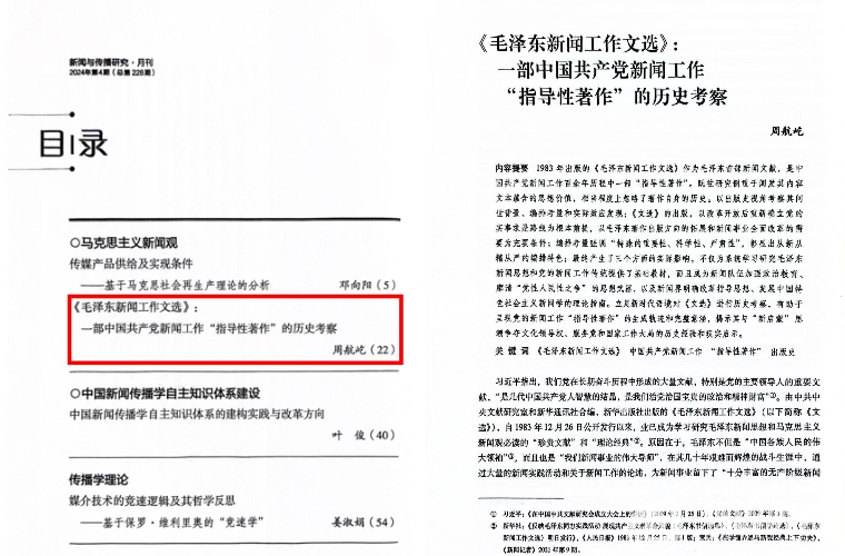 本站讯 近日,文学与新闻传播学院青年教师周航屹撰写的论文《<毛泽东新闻工作文选>:一部中国共产党新闻工作“指导性著作”的历史考察》在国内新闻学与传播学顶级学术期刊《新闻与传播研究》2024年第4期发表。