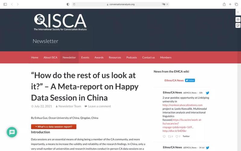 日前,由国际会话分析学会(ISCA)约稿、学校会话分析研究团队(OUCA)成员郭恩华博士撰写的学术性报道文章“How do the rest of us look at it?”– A Meta-report on Happy Data Session in China”在国际会话分析学会通讯简报(ISCA Newsletter)发表。