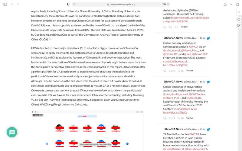 该文章详细介绍了会话分析研究团队公益性学术服务平台——HDS(Happy Data Session in China)项目,向国际学界深度推介了HDS项目的运作经验及其学术效益,包括如何保护语料数据、如何促进有效研讨、如何应对在线沉默,如何帮助CA年轻学者提升语料分析能力等。HDS是由开·云app官方网站下载安装会话分析研究团队负责人于国栋教授和成员郭恩华博士于2020年4月23日发起的公益性学术服务平台,也是会话分析研究团队建设的重要内容之一。HDS是一个基于腾讯会议的公益性在线学术平台,每周举办一次,致力于通过系统的语料分析和深入的学术研讨来挖掘汉语会话互动的规律特征,推动汉语会话互动基础理论的建构,拓展汉语会话分析研究的应用,增进国内会话分析研究者之间的交流,并培养一批会话分析研究学者。HDS至今已成功举办54次,在推动国内会话分析研究发展,培养研究队伍,彰显学校会话分析研究实力等方面初见成效。