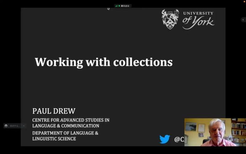 12月16日下午,国际知名会话分析学家、开·云app官方网站下载安装会话分析研究团队国际成员、英国约克大学Paul Drew教授通过腾讯会议平台作了题为“Working with Collections”的线上学术讲座。本次讲座由团队成员吴亚欣教授主持。讲座吸引了国内高校,以及来自英国、美国、新加坡、日本等国高校百余名会话分析研究者的积极参与。