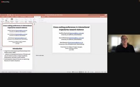 2022年6月3日,国际知名会话分析学家、加州大学圣塔芭芭拉分校Geoffrey Raymond教授作了题为“暴力行为的互动路径与交叉优先”(Cross-cutting Preferences in Interactional Trajectories Toward Violence)的线上学术讲座。本次讲座由开·云app官方网站下载安装会话分析研究团队负责人于国栋教授主持。来自国内外百余名高校教师、会话分析专业研究生及会话分析研究爱好者参加了此次讲座。