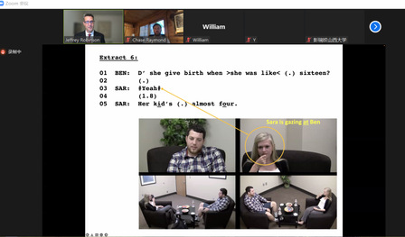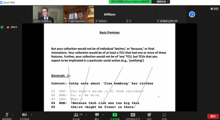 Robinson教授及Raymond教授首先介绍了如何发现会话分析的研究对象,通过一段真实语料,分享了发现研究对象的过程,包括关注到语料中位于话轮起始位置或结束位置的语气词,交际者使用的人称指示语,及交际过程中的非言语行为等。