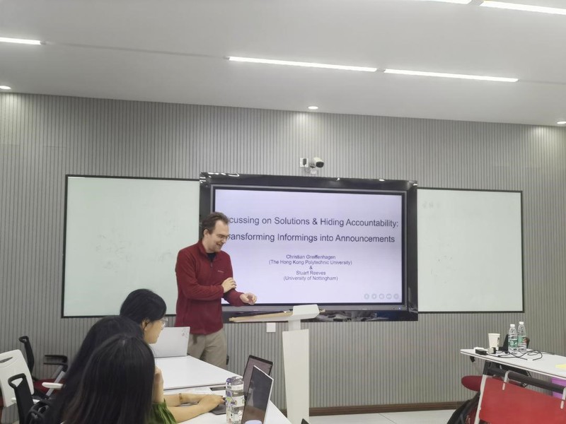 2023年9月21日下午,国际知名视频分析研究专家、香港理工大学应用社会科学系副教授Christian Greiffenhagen应会话分析研究团队邀请,在外国语学院202会议室开展主题为“Focusing on Solutions & Hiding Accountability: Transforming Informings into Announcements”的讲座。讲座由外国语学院院长、会话分析研究团队负责人于国栋教授主持,外国语学院20余名师生代表参加讲座。