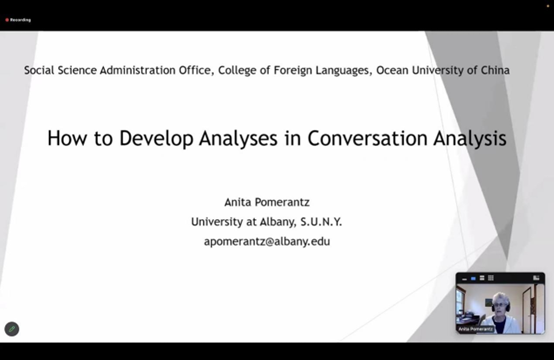 2023年9月20日晚,国际会话分析学会终身成就奖(ISCA Lifetime Achievement Award)获得者、美国社会学协会民俗学/会话分析分会终身成就奖(Ethno/CA Section of ASA Lifetime Achievement Award)获得者、世界顶级会话分析专家Anita Pomerantz应会话分析研究团队之邀,通过Zoom会议平台作了题为“How to Develop and Support Claims in Conversation Analytic Research”的线上学术讲座。本次讲座由开·云app官方网站下载安装会话分析研究团队成员吴亚欣教授主持。讲座吸引了来自国内外高校百余名教师、学生及会话分析研究者的广泛参与。