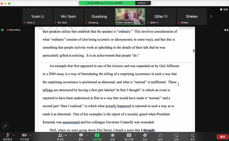 2023年11月22日晚,美国著名交际学家、纽约州立大学奥尔巴尼分校荣退教授Robert E. Sanders应学校会话分析研究团队之邀通过Zoom 会议平台作了题为“Participating in Interactions Coherently and Participating Effectively”的线上学术讲座。他的主要研究兴趣为语言交际、跨文化交际、交际能力等,尤其关注人们在互动时完成的复杂的交际任务。本次讲座由会话分析研究团队吴亚欣教授主持,吸引了超过120名来自国内外高校名教师、学生及会话分析研究者的广泛参与。