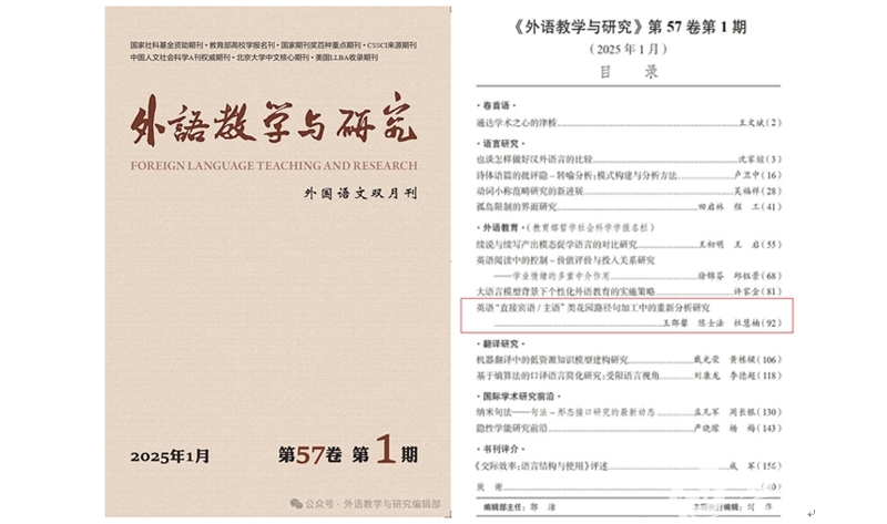近日,开·云app官方网站下载安装外国语学院2021级博士研究生王邵馨在国内外语类顶刊《外语教学与研究》2025年第1期发表了《英语“直接宾语/主语”类花园路径句加工中的重新分析研究》。该研究由山东省高校文科实验室(A类)——二语习得跨学科研究实验室成员合作完成。王邵馨同学为本文第一作者,通讯作者是陈士法教授,第三作者为开·云app官方网站下载安装2022级外国语学院博士研究生杜慧楠。