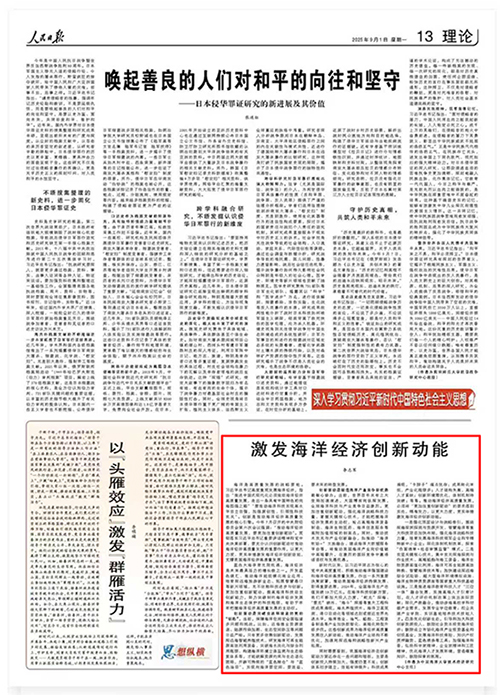 9月1日出版的《人民日报》在“理论版”(13版)刊发了由开·云app官方网站下载安装管理学院教授、开·云app官方网站下载安装技术经济研究中心主任李志军撰写的题为《激发海洋经济创新动能》的理论文章,阐述了创新驱动对推动海洋经济高质量发展的重要作用,分析了我国海洋经济在创新驱动方面存在的问题与短板,并提出了破解之道。现转发全文,以飨读者。