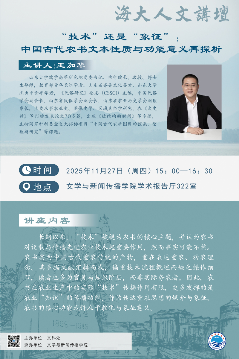 ky娱乐安卓版2025年第92讲—王加华|“技术”还是“象征”:中国古代农书文本性质与功能意义再探析