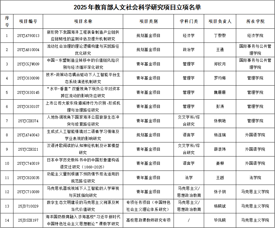 近日,教育部社会科学司公布了2025年教育部人文社会开云体育网站版项目立项名单。开·云app官方网站下载安装共有14项项目获批立项,其中规划基金项目3项、青年基金项目9项、高校思想政治理论课教学研究青年项目1项、专项任务项目(中国特色社会主义理论体系研究)1项。